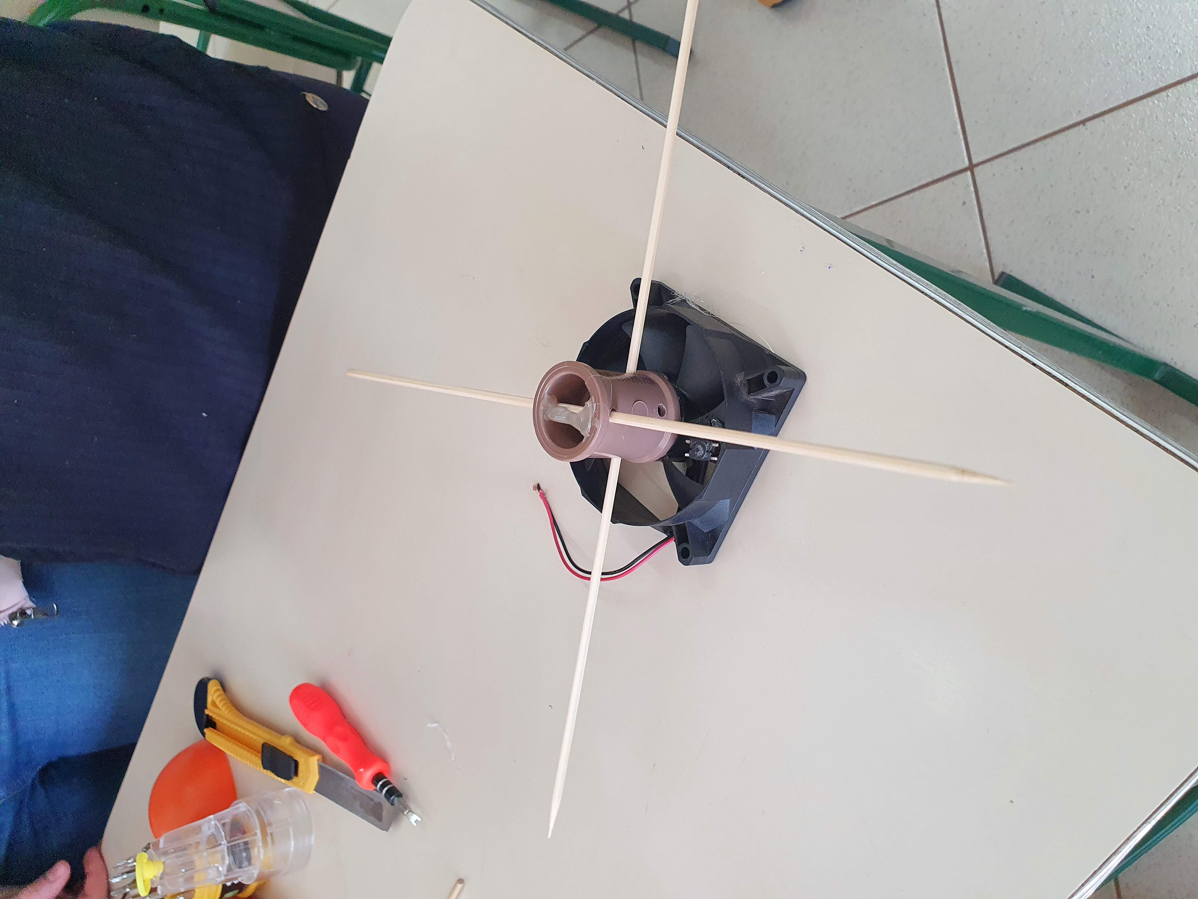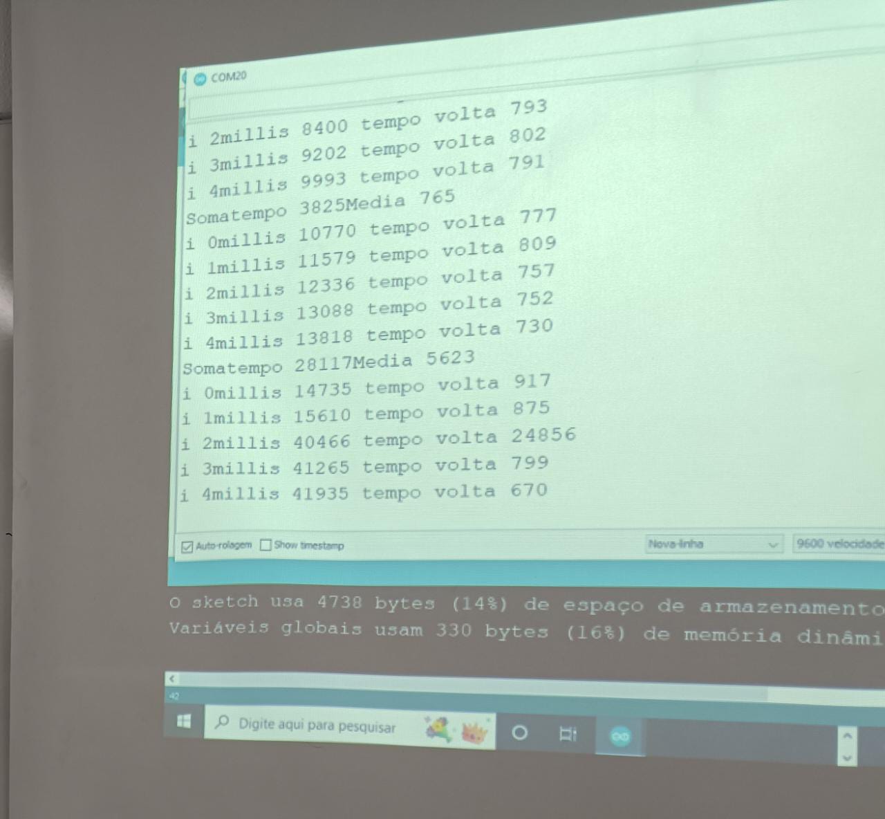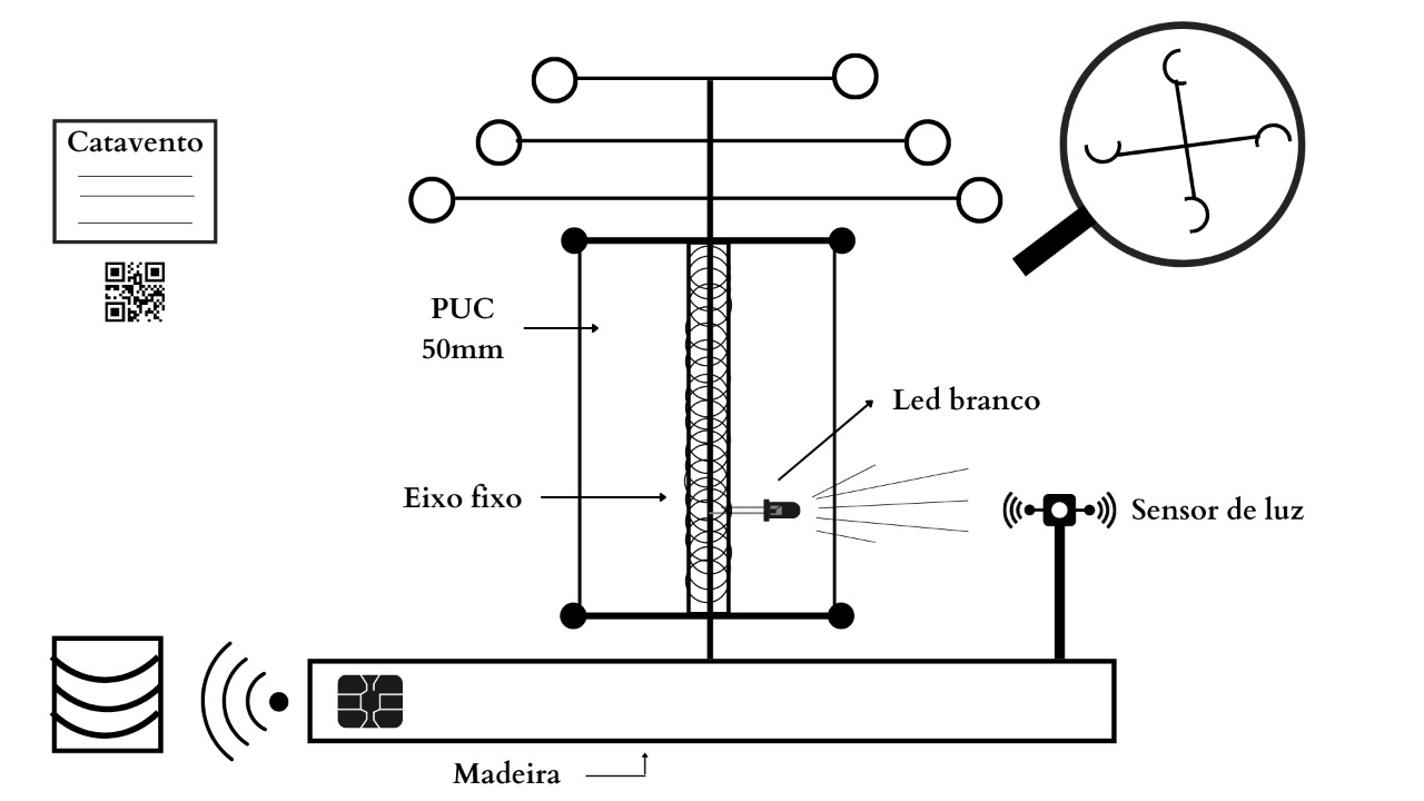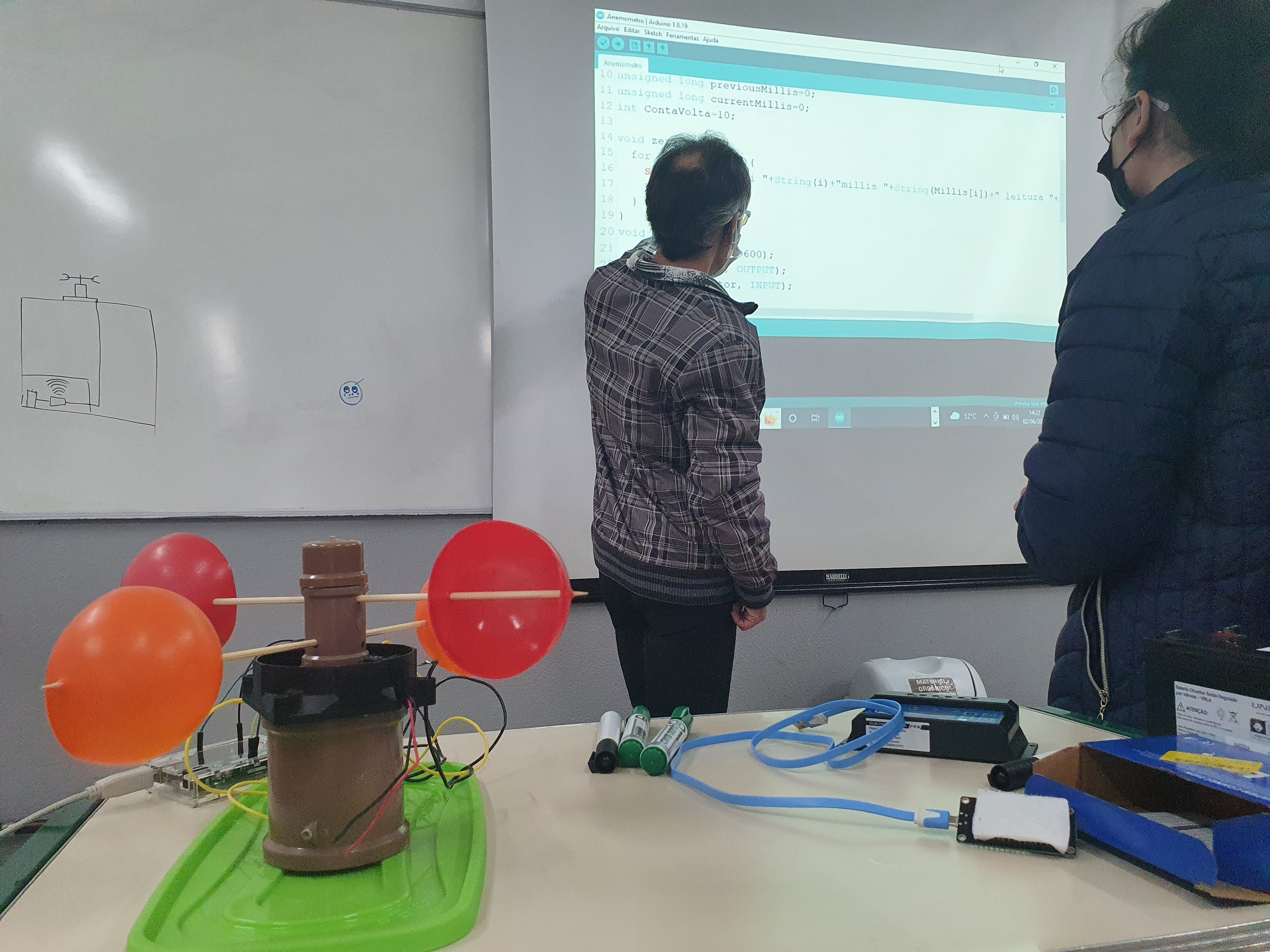 Nesse dia foi dado continuidade à montagem do código: foi preciso descobrir uma forma de calcular a velocidade do vento através da plataforma arduíno. Para isso, foi usado como base quanto tempo leva para o protótipo dar um determinado número de voltas ao redor do próprio eixo.
